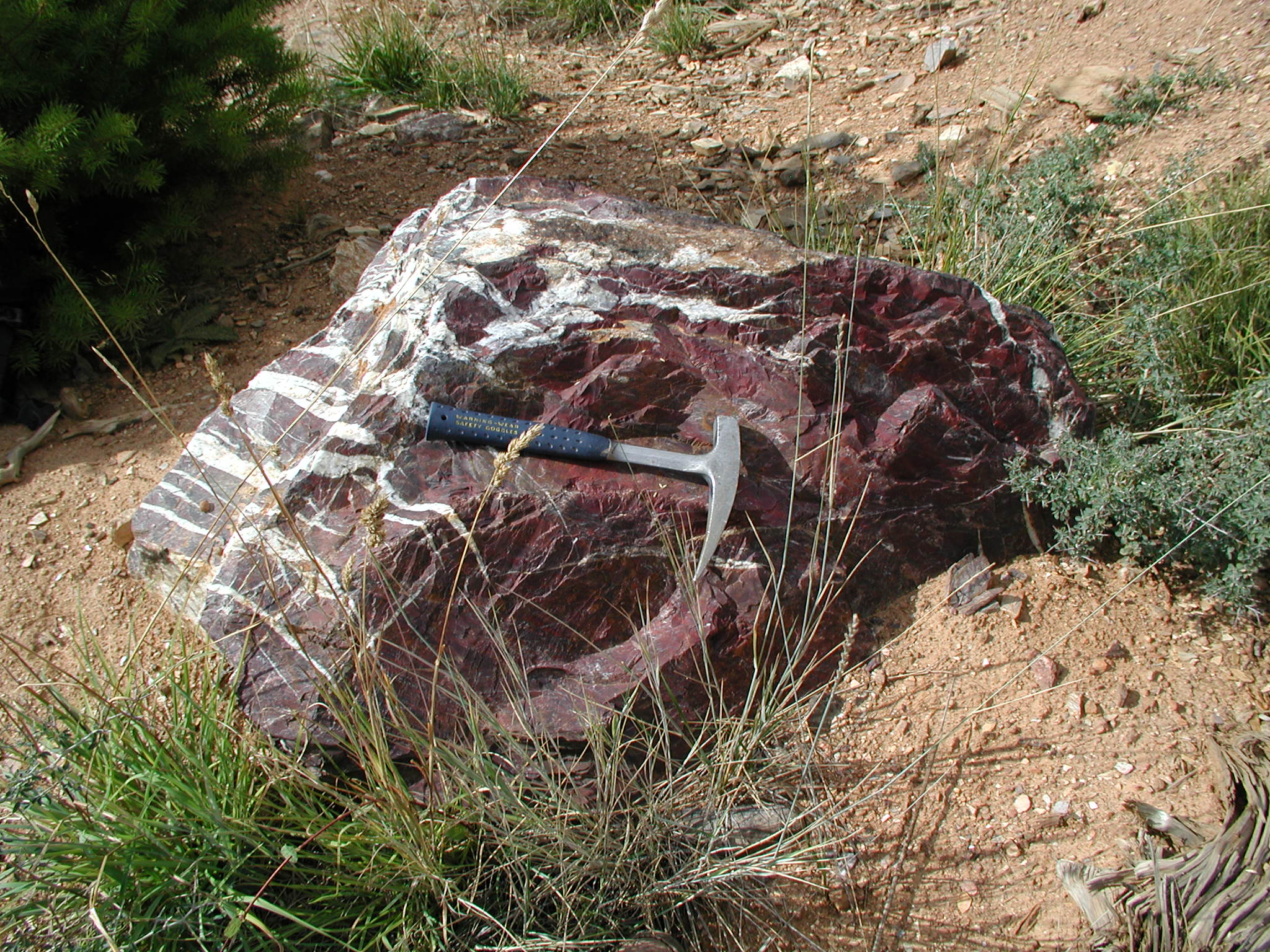 Red jasper and specular hematite veined with white quartz in a block of rock from the area southeast of Canyondam.