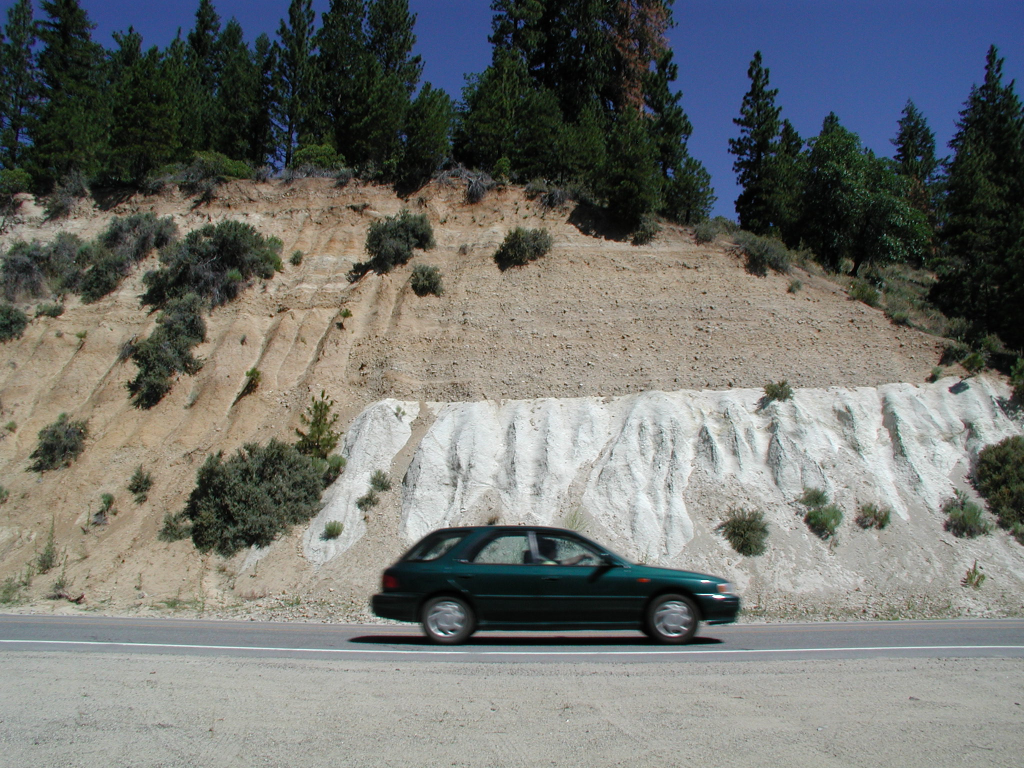 White rhyolitic ash-flow tuff (tuff of Sutcliff?) overlain by Pliocene Mohawk beds along Highway 70 east of Blairsden.