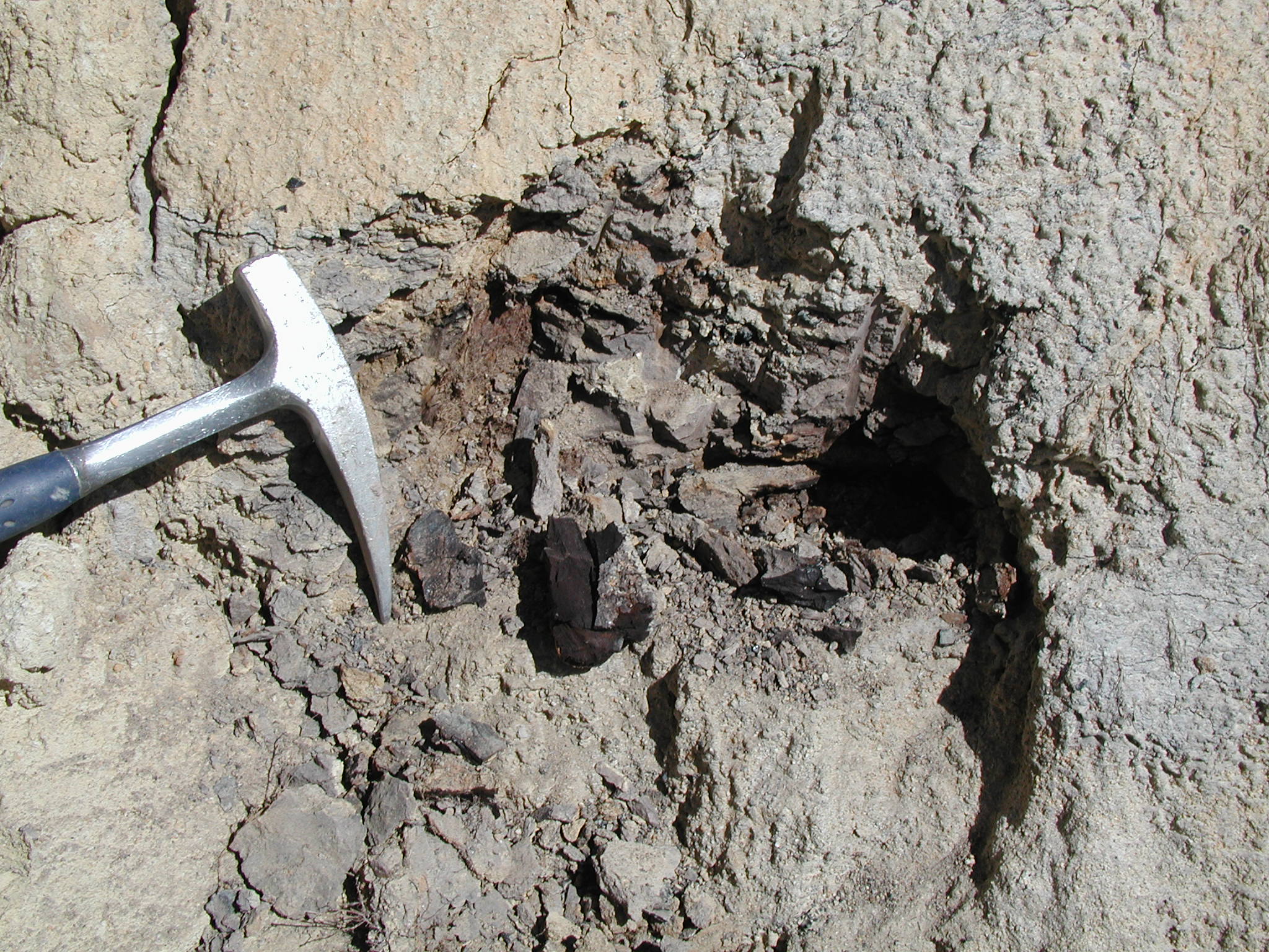 Carbonaceous claystones exposed below La Porte tuff at Upper Dutch Diggings near La Porte.