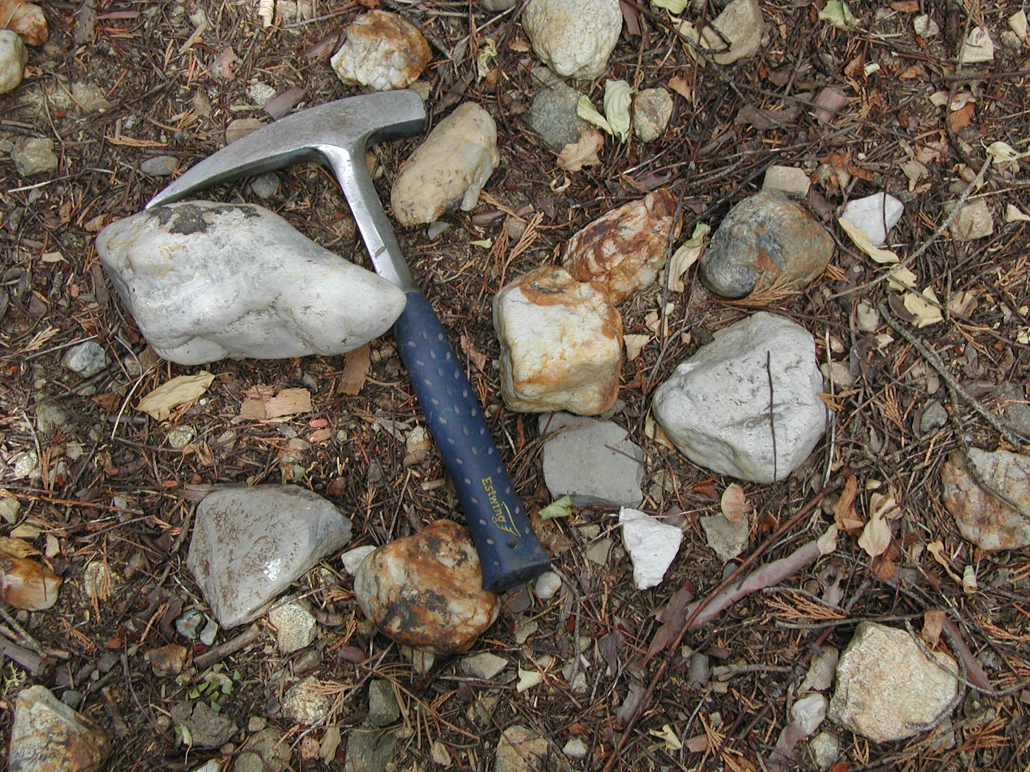 Rounded and polished quartz clasts found in float near possible site of Sweet Oil Diggings. One clast has attached, iron-oxide cemented matrix. Hammer head is 18 cm.