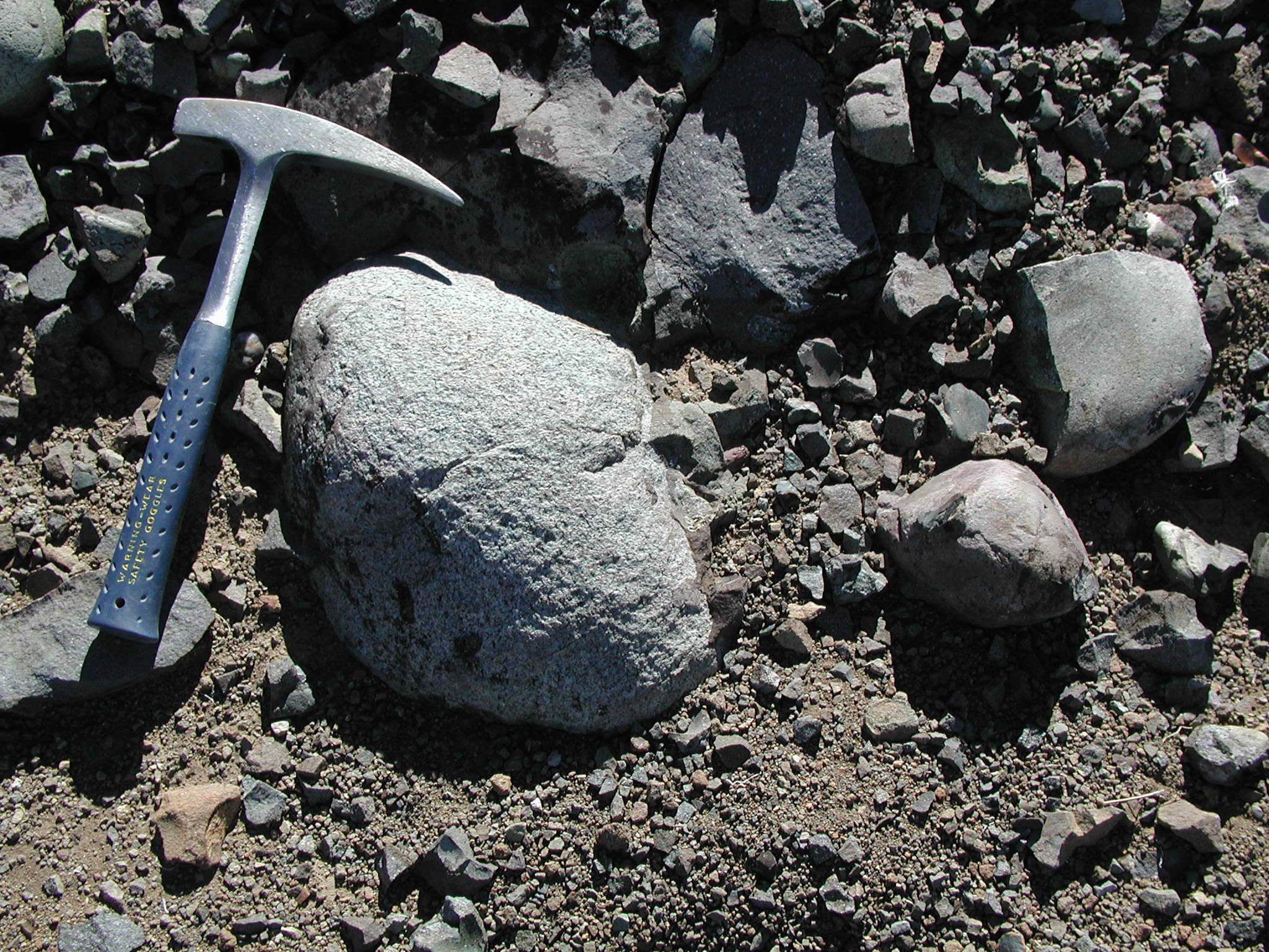 Rounded boulder of Cretaceous granitic rock in conglomerate near the Susanville Flora locality at the head of Cheney Creek. Hammer is 32 cm long.