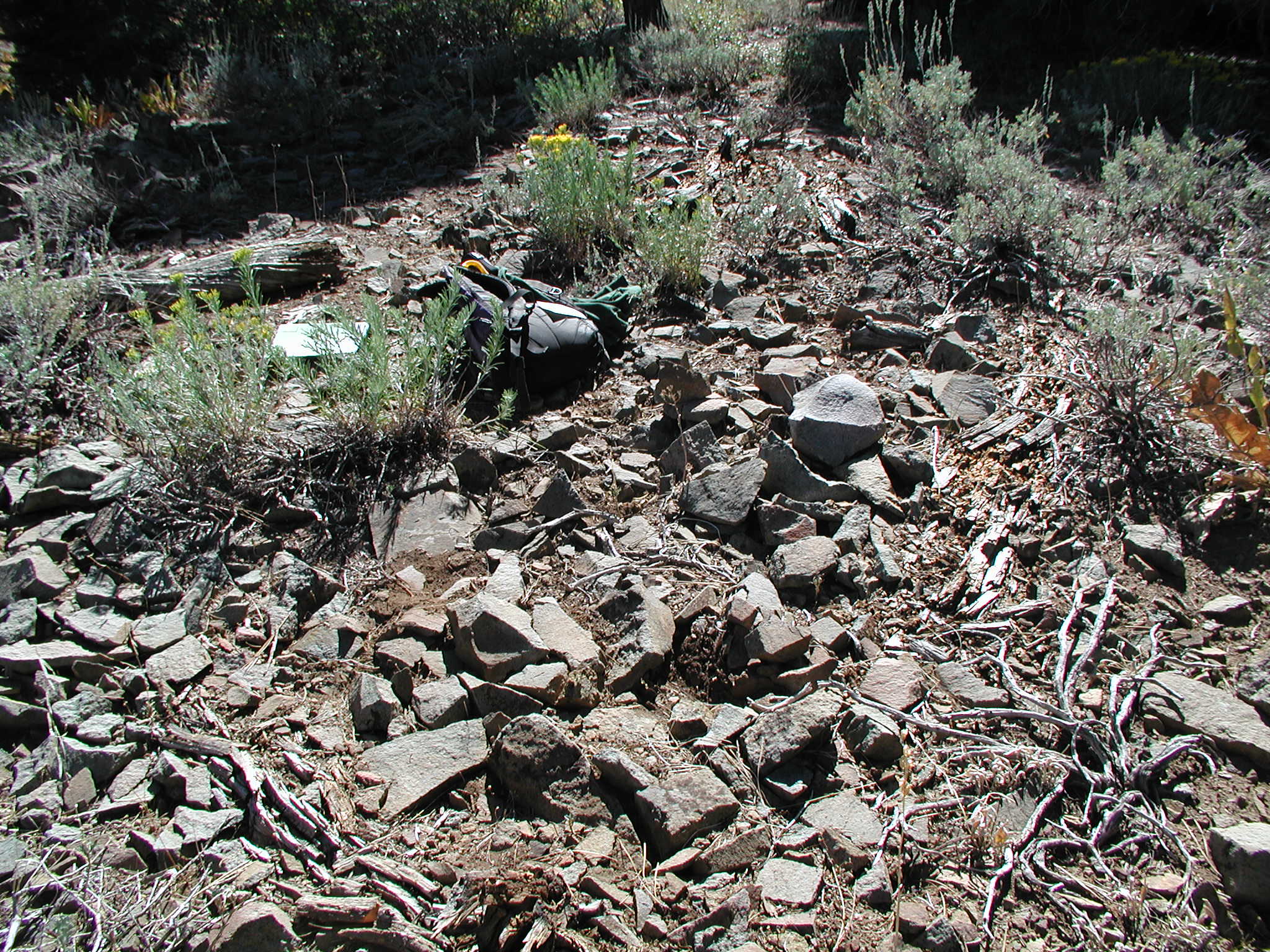 Outcrop of hornblende andesite flow which crops out stratigraphically above the Susanville Flora at the head of Cheney Creek.