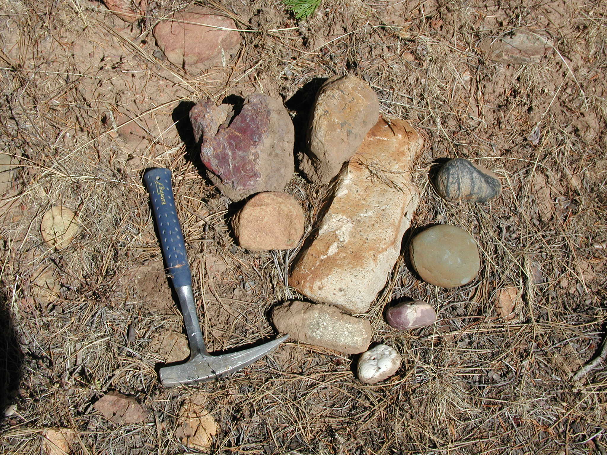 Clasts from Auriferous Gravel in the vicinity of Taylor Diggings, including red jasper and black tourmaline-veined granitic rock.