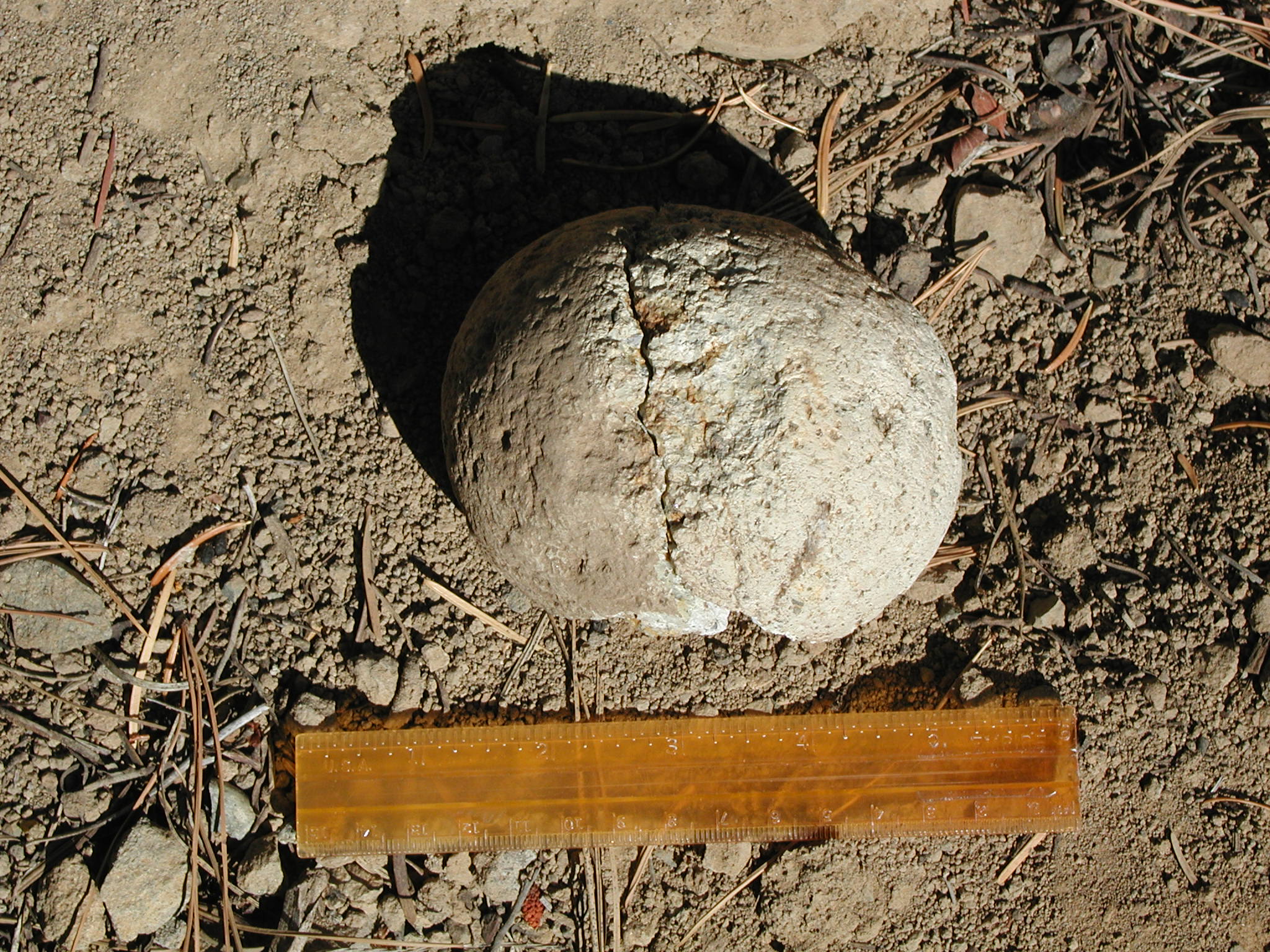 Rounded clast of tuff of Campbell Creek(?) collected from float, east of Fant Creek (East Branch of Lights Creek area). Ruler is 15-cm.
