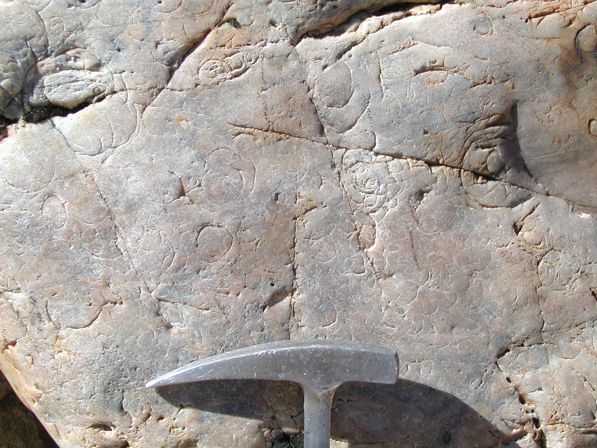 Crescentic percussion marks on quartzite boulder, Diamond Creek Placer. Hammer Head is 18 cm.