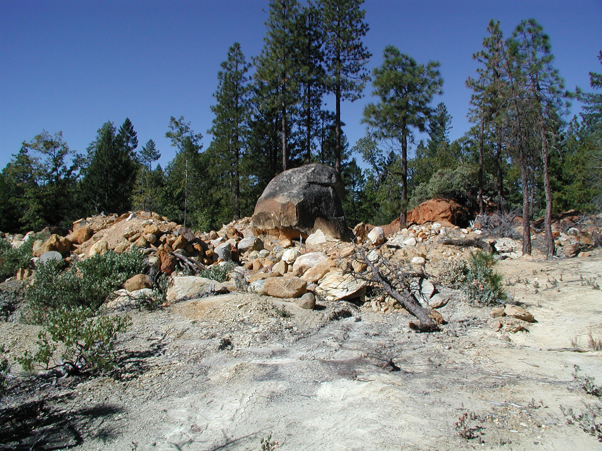 Coarse-reject boulder piles at Diamond Creek Placer. Large metaconglomerate boulder is approximately 3 m in diameter.