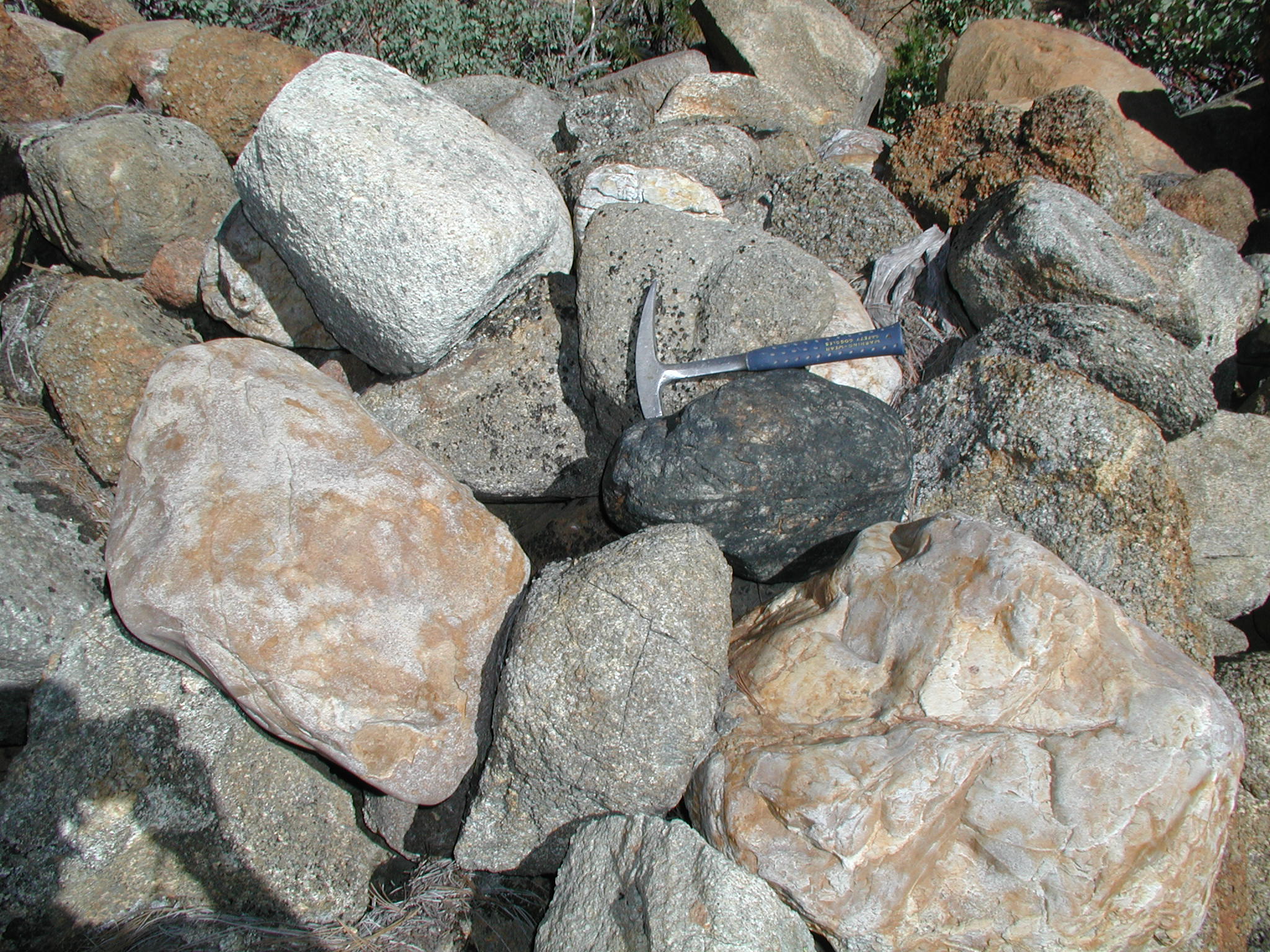 Boulders of black tourmaline, white quartz, and gray metaconglomerate at the Diamond Creek Placer.