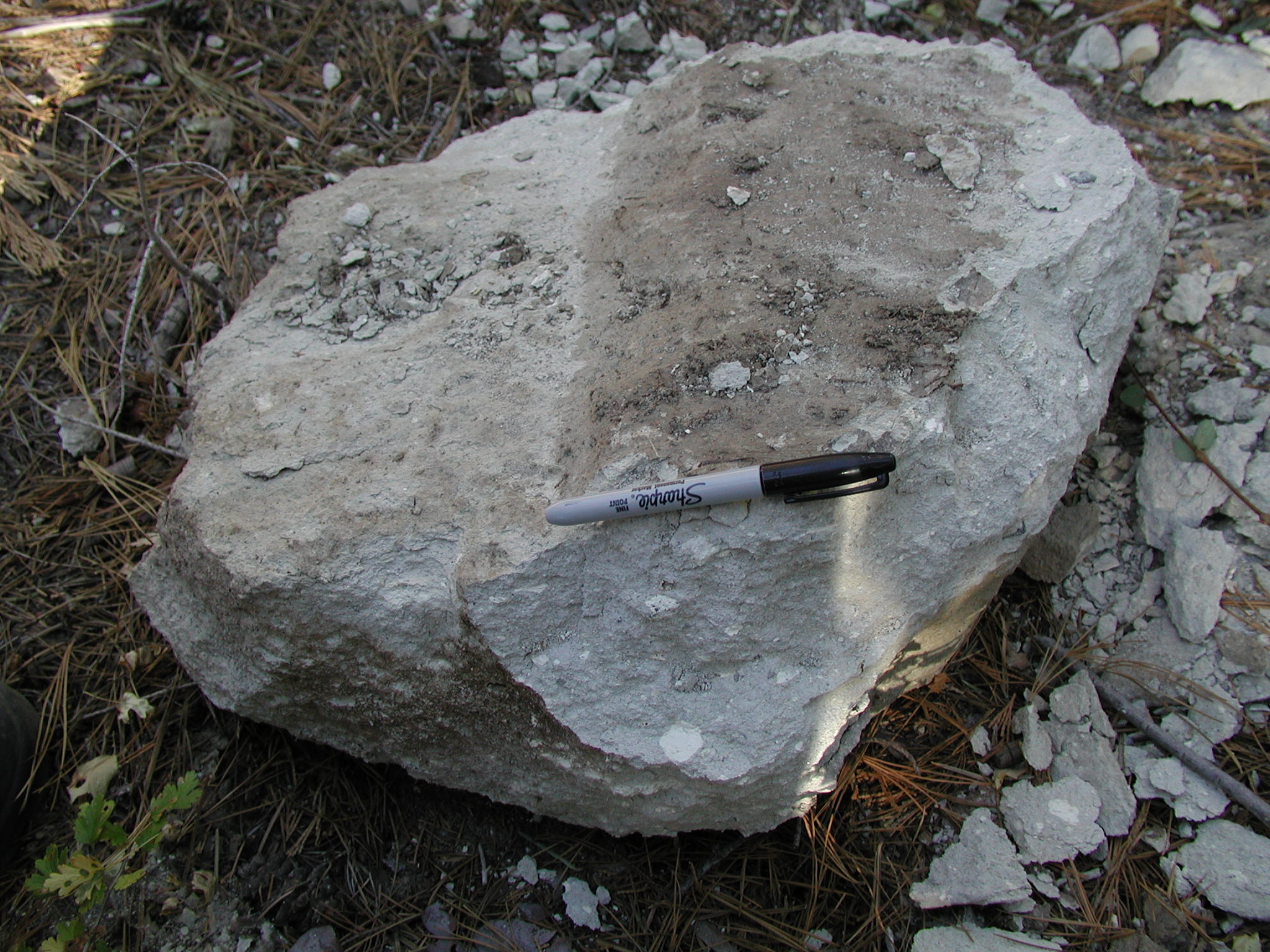 Block of ash-flow tuff that is exposed 1.2 km southeast of Diamond Creek Placer. Pen is 13 cm.