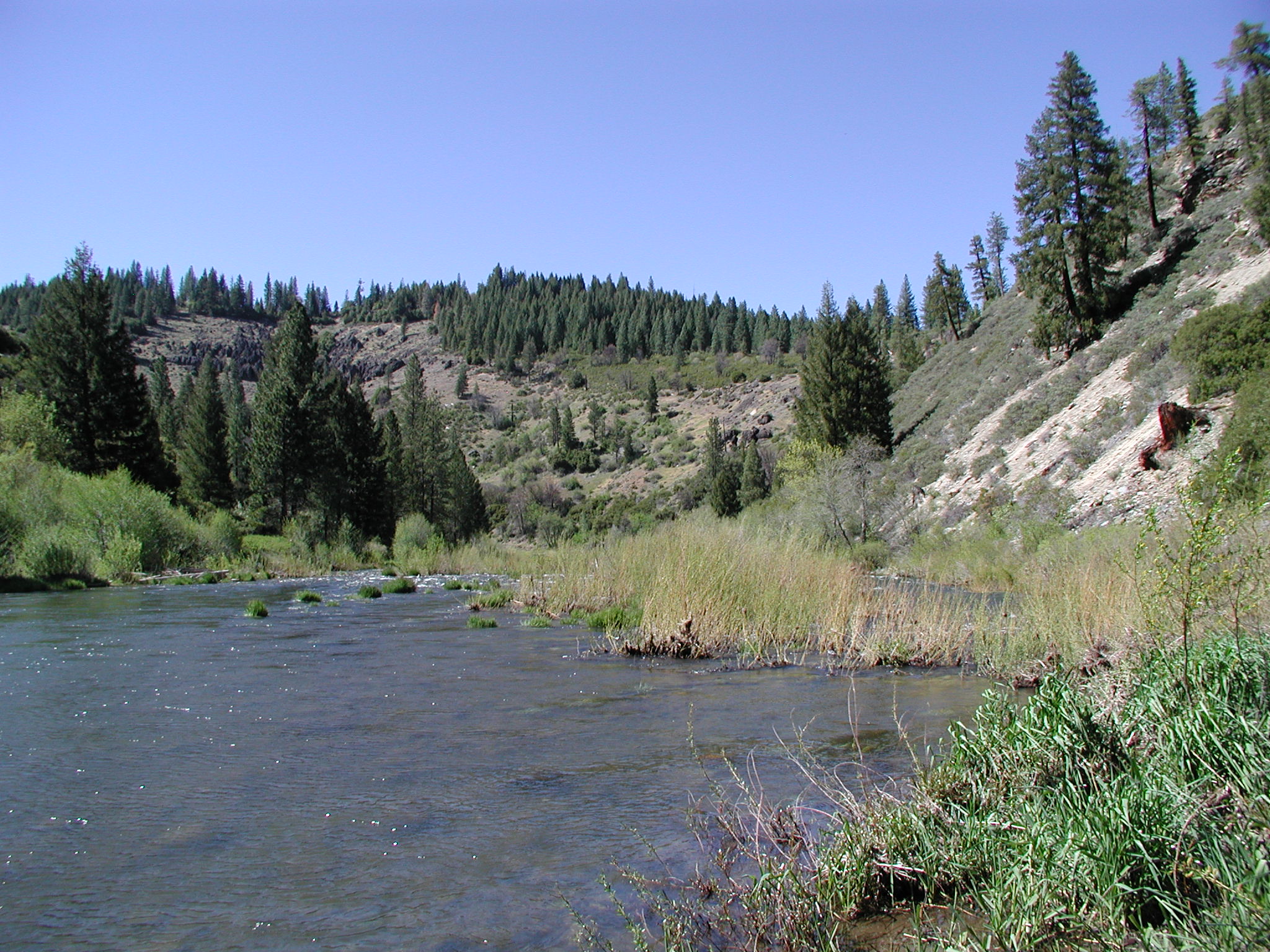 Basal andesite-clast gravels at river level in mid distance overlain by darker lahars to upper left; Shoo Fly to near right. North Fork Feather River, Nelson Point.