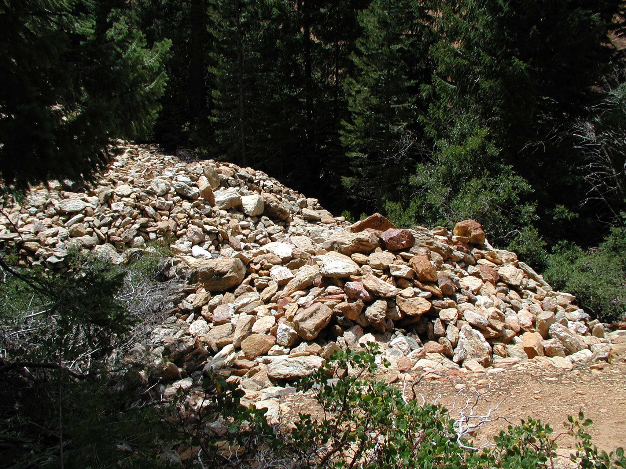 Coarse reject piles of subrounded boulders and cobbles at the Squirrel Creek Mine.