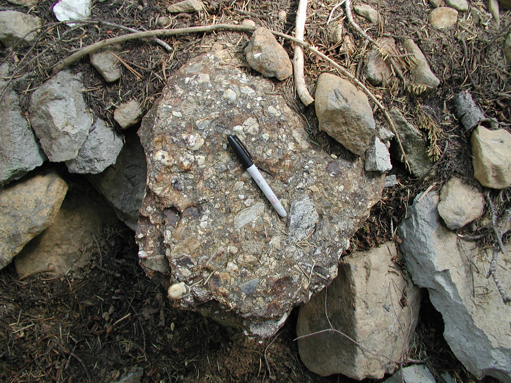 Quartz- and phyllite-pebble conglomerate, Bunker Hill Mine. Marking pen is 13.5 cm.