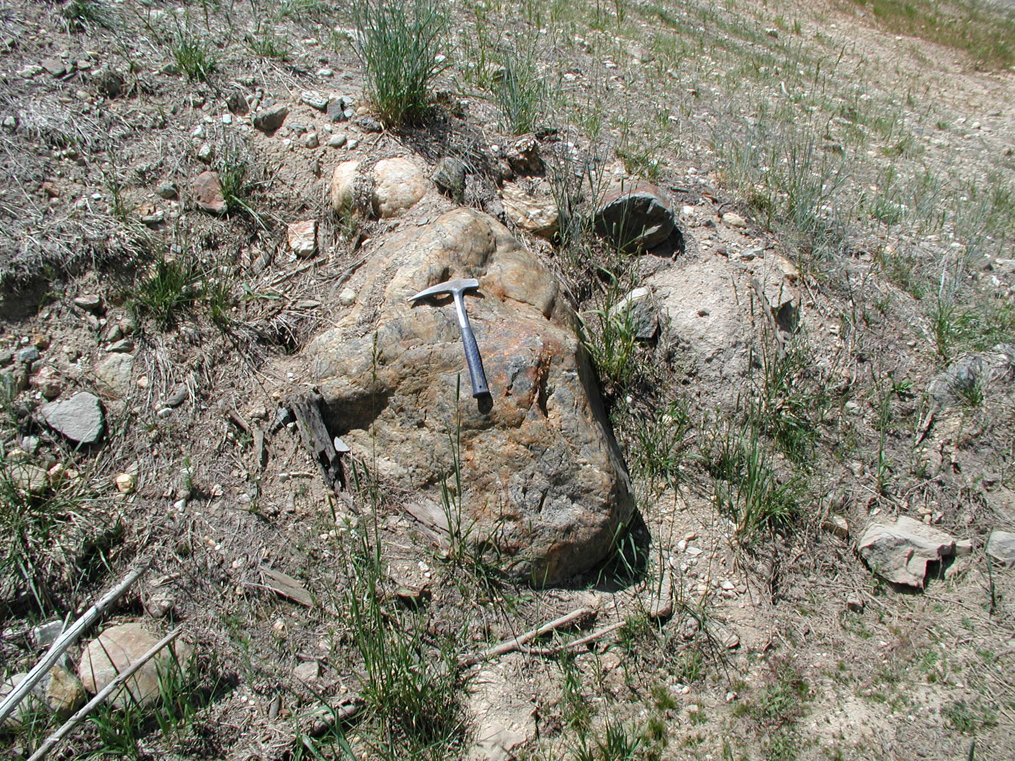 Boulder at Union Hill Mine. Hammer is 32 cm long.