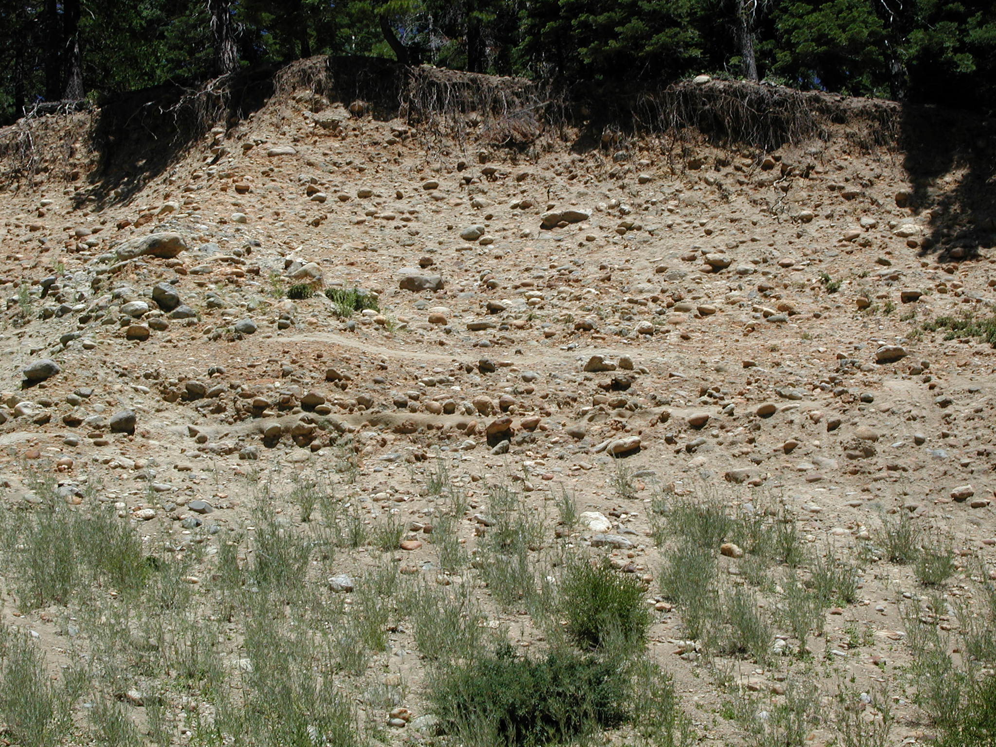 Worked face at Cascade Mine; note inclined disk-shaped cobbles, probably on indistinct foreset beds