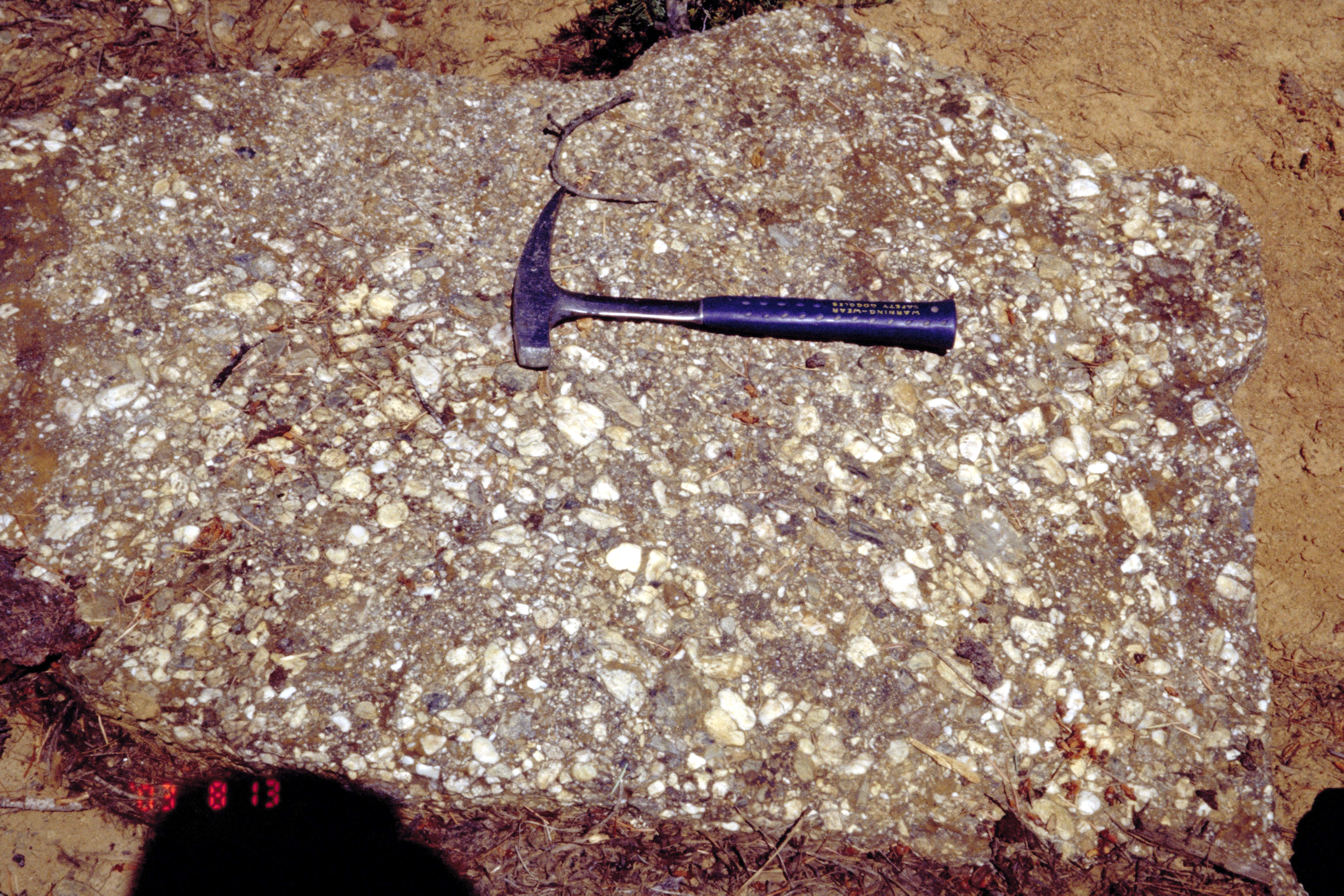 Block of quartz-pebble conglomerate of the Auriferous Gravel, Richmond Hill workings. Hammer is 32 cm.