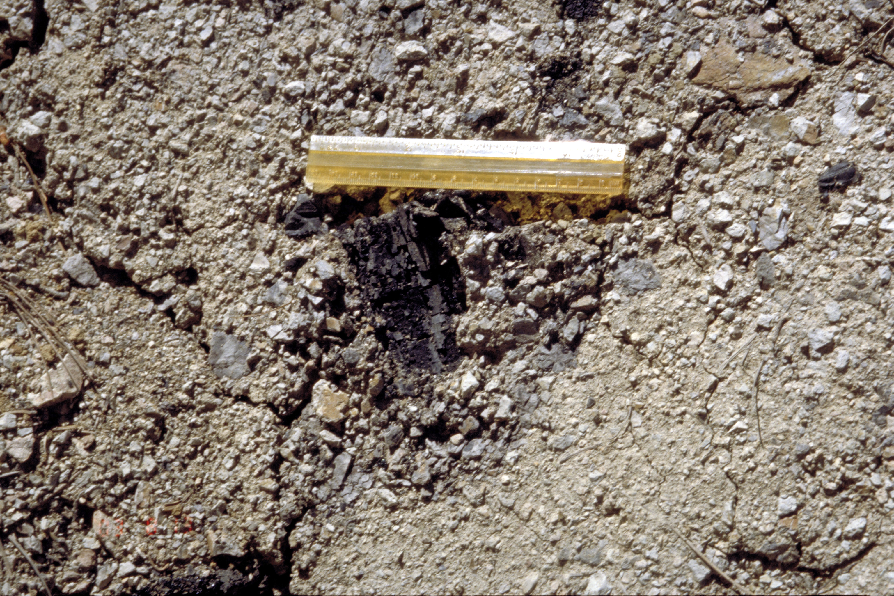 Black fragment of wood in Auriferous Gravel at Richmond Hill workings. Ruler is 15 cm.