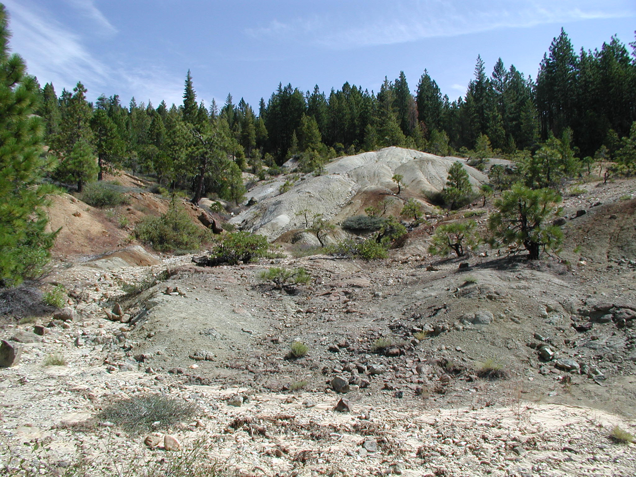 Dark outcrops of serpentinite bedrock stripped of Auriferous Gravels by hydraulick mining; white pipe clays in distance. Bean Hill workings