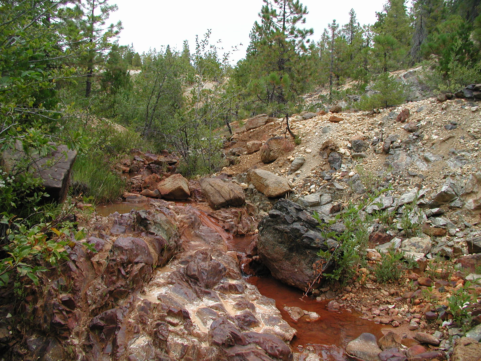 Iron-stained serpentinite in stream course overlain by quartz-pebble gravel that was disturbed by hydraulicking. Mulligan Slide area.